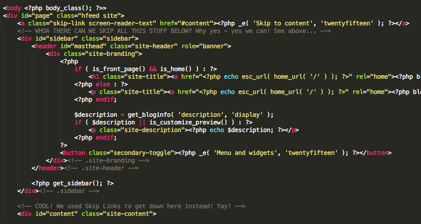 Code-wise, this is how you would implement a skip link, and guess what? It makes use of that awesome class we talked about earlier, screen-reader-text! Gotta love that thing.