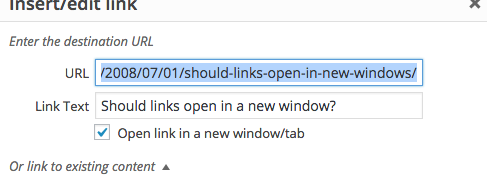 And we’re finally at the end. Together with writing links in context, focus styles, screen reader classes and skip links, I think that covers the most required concepts for accessible links. The only thing that stumps me though, is assuming new windows/tabs are bad, and we agree to implement not doing that, how would we prevent that in the WordPress text-editor. Like this post, I’ve inserted the links using the TinyMCE buttons where it specifically asks if it opens in a new tab or window.