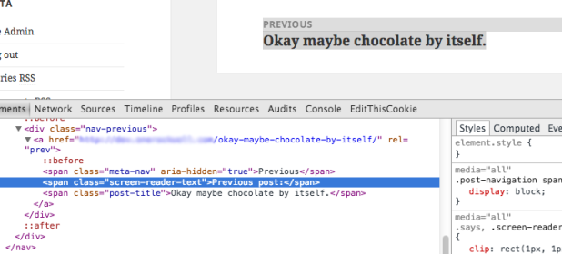 In the case of the Twenty Fifteen example, the theme is also using the screen-reader-text class on the links that paginate between WordPress posts in single view. Visually this reads as “Previous, Title of post.” On screen-readers, it will be read as, “Previous post: Title of post.”