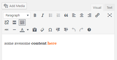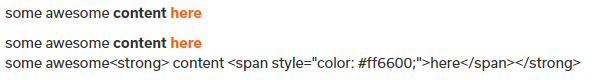 Let’s say I write some content on the dashboard for a page and part of that content, I decide to make bold and change a color using WordPress’ TinyMCE toolbar. This is what it looks like on the dashboard:
