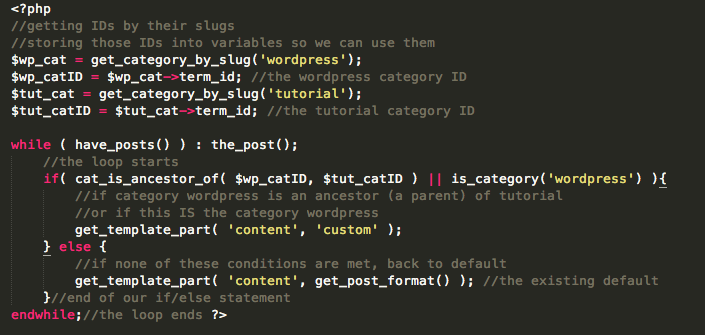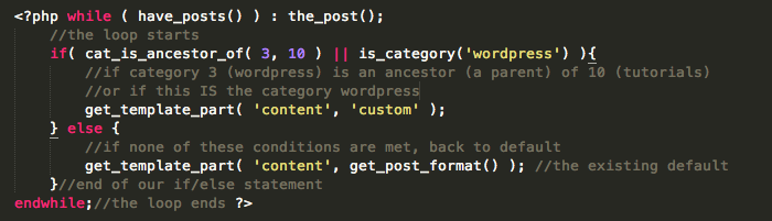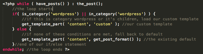 - Then enter the if statement: If this IS the category “wordpress” OR if this is IN the category “wordpress”, then get template part content-custom.php. Keep in mind that we’re using the slugs of the categories, hence the lowercase in “wordpress”.