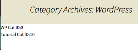 And there you have it! If you want to troubleshoot this in the event that it’s not working, feel free to echo out your variables to ensure that you’re actually getting the IDs you want. In my case, I should be getting 3 for the WordPress category and 10 for the Tutorial category. If I drop this snippet after my get slugs and IDs business, but before the loop starts, I should see this on my category archive page: